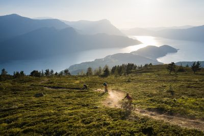 The sun sets behind the mountains on the other end of the Fjord. We are flying down the flowy trails above the tree line. The trail feels as it grew out of the landscape. Like it would already exist for thousands of years.